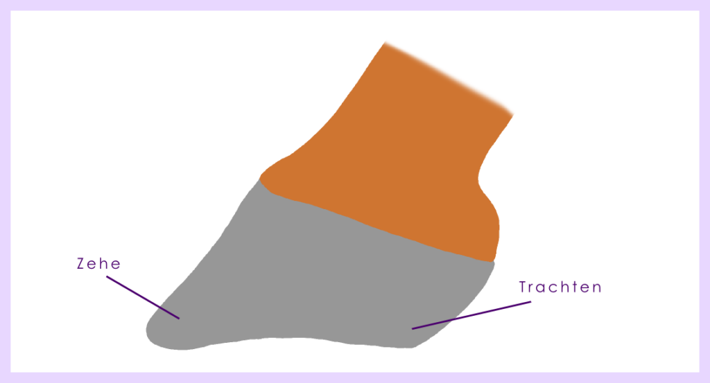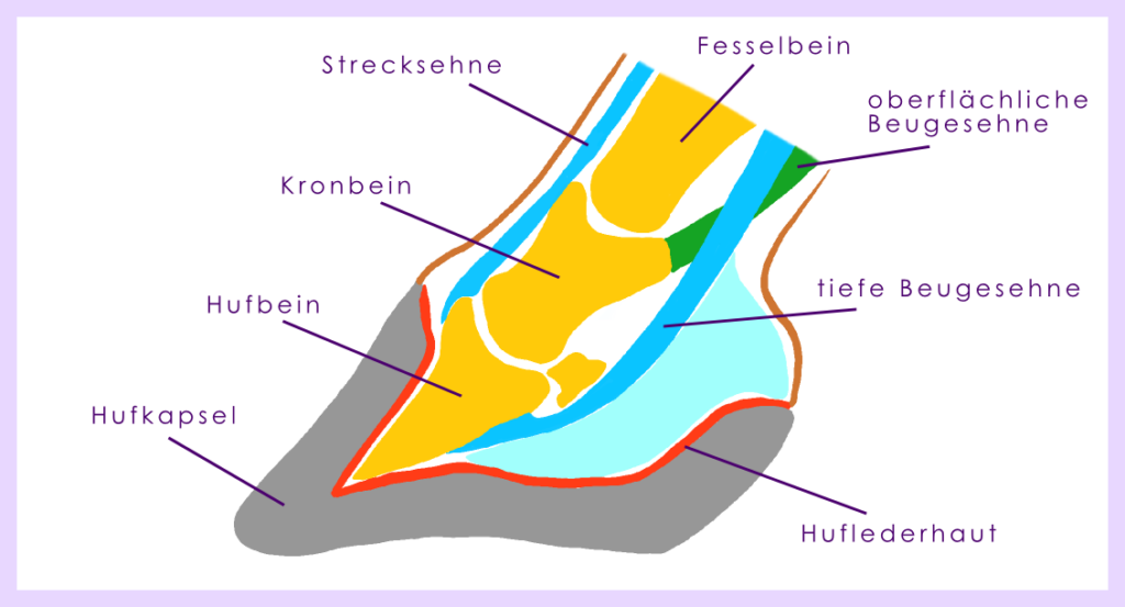 Der Hufaufbau ist sehr umfangreich, ich gehe hier jedoch nur auf das für diesen Blogartikel notwendige ein. Wie der Hufaufbau vereinfacht von innen aussieht, siehst du im nächsten Bild. Innen liegen die Knochen: von oben her das Fesselbein, Kronbein und das Hufbein. Am Hufbein vorne setzt die Strecksehne an und hinten die tiefe Beugesehne. Abgepolstert wird u.a. alles durch das Ballen- und Strahlpolster (in türkis dargestellt). Die Huflederhaut verbindet den gesamten Huf mit der Hufkapsel. Das kannst du dir vorstellen wie eine Art Klettverschluss, der die Hufkapsel am Huf hält. Von außen betrachtet ist vorne am Huf die Zehe oder auch Zehenbereich und Hinten unten sind die Trachten.