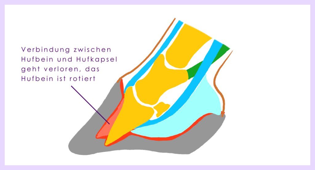 Was passiert also im Körper? In den Körper sind wodurch auch immer, vereinfacht gesagt „Giftstoffe“ gelangt, die nicht dahin gehören, bzw. zu viel auf einmal oder im Ungleichgewicht sind. Das Pferd hat Schmerzen, geht deshalb fühlig und widerwillig auf hartem Untergrund oder will sich gar nicht mehr bewegen. Das Hufbein kann rotieren, sich absenken oder beides und durch die Hufsohle brechen. Das Pferd kann sogar „ausschuhen“, was bedeutet, dass sich die komplette Hufkapsel vom Huf löst. Beim Menschen wäre das, dass sich der Fingernagel vom Finger löst. Hufbeindurchbruch und das Ausschuhen sind oft ein Todesurteil für ein Pferd, die leider heute noch verbreitete Denkweise. Aber selbst hierbei kann dem Pferd noch geholfen werden.